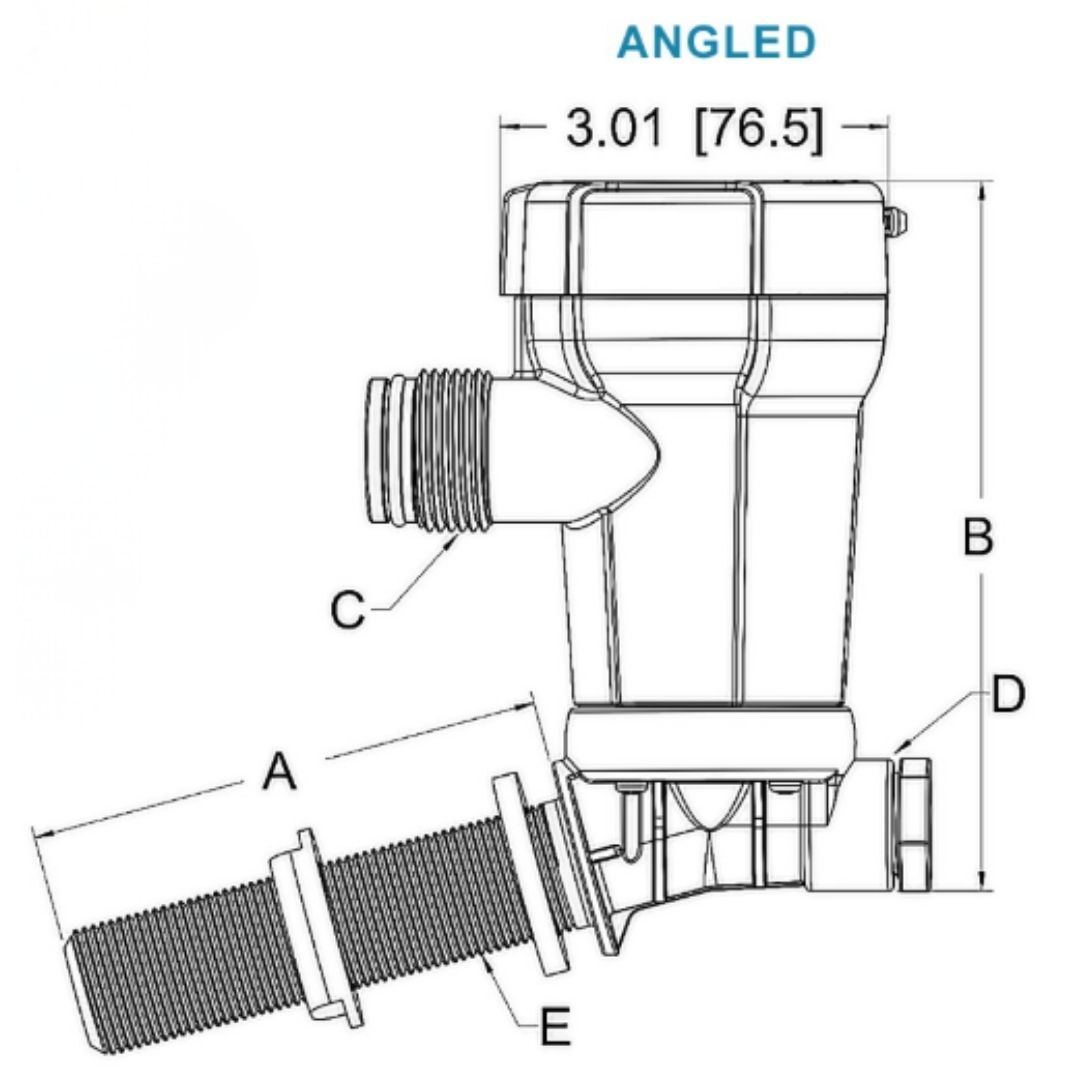 RWB5231 Rule Livewell pump, 500GPH, dual port, angled thru-hull 500GPH 3/4" NPSM 4.17 (104.4) 5.62 (142.8) 1-11.5 NPSM 1/2-14 NPT 3/4-14 NPSM 3/4" 12V 3.0A 5 A