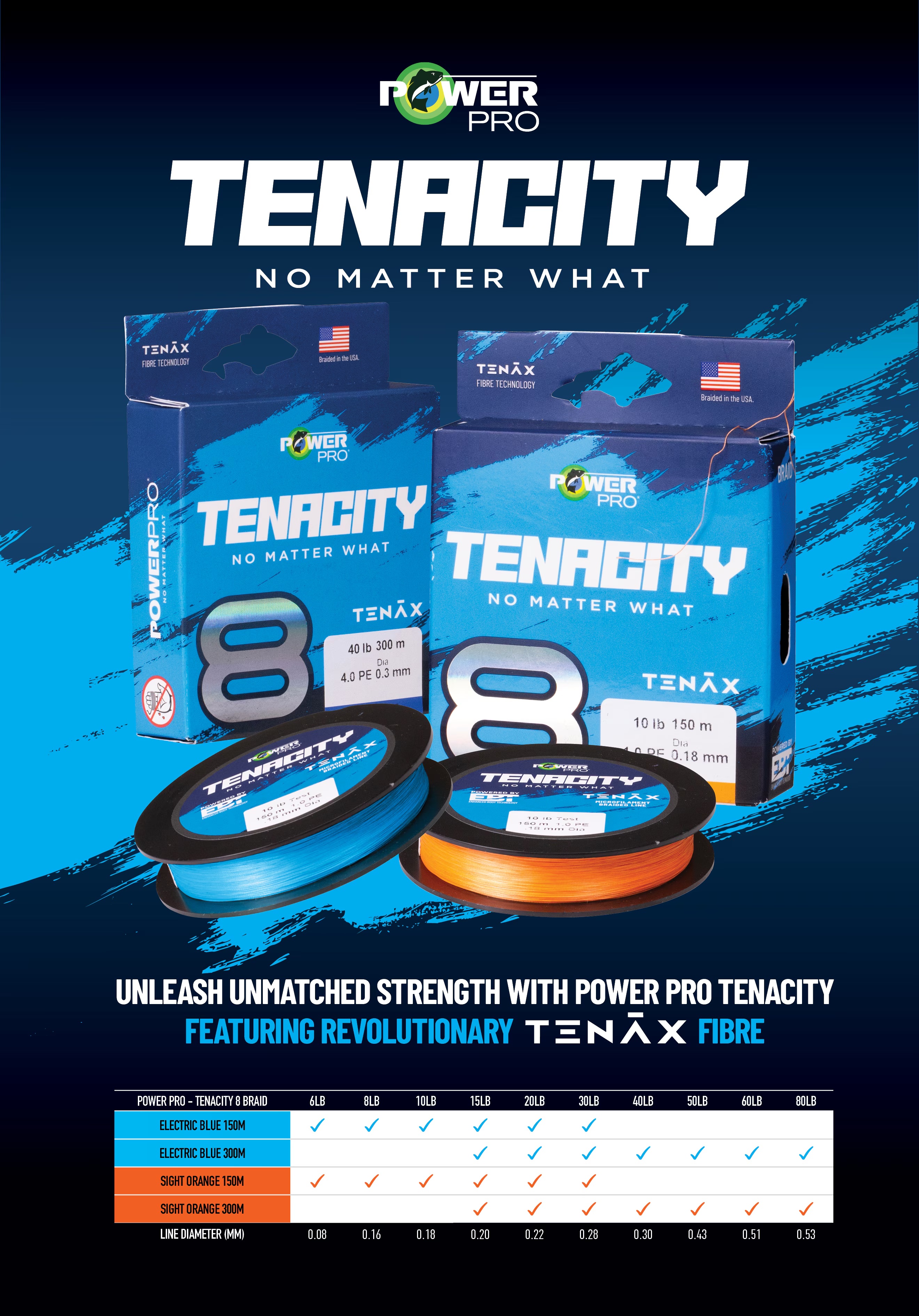 PowerPro Tenacity is a high-performance braided fishing line crafted for anglers who demand unwavering strength and reliability. Engineered with advanced Tenax fibres, this eight-strand braid delivers superior abrasion resistance and tensile strength, making it ideal for fishing in rugged environments like reefs, rocks, and heavy timber. Its smooth, round profile enhances casting distance, knot security, and spool efficiency, while maintaining a balanced hand feel and long-lasting colour retention. Available in high-visibility Electric Blue and Sight Orange, PowerPro Tenacity performs flawlessly across bait and lure applications, on both spinning and baitcasting setups. Whether you're battling hard-fighting fish or navigating harsh conditions, PowerPro Tenacity is built to hold strong—no matter what.