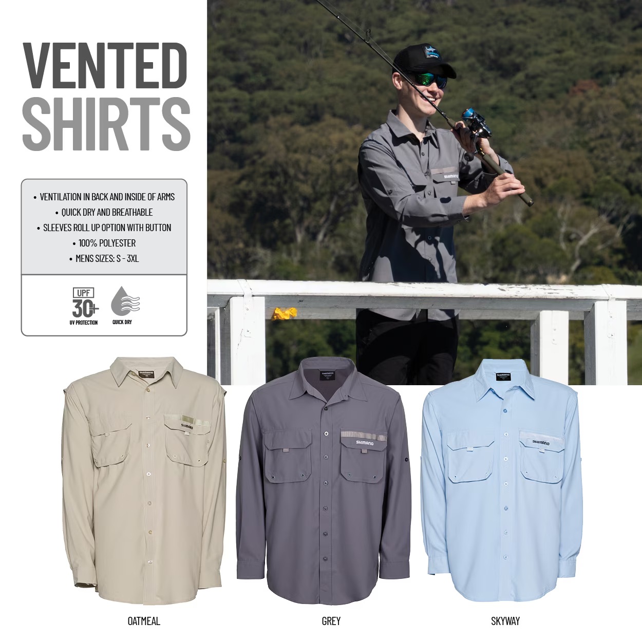 The legendary Shimano long sleeve vented shirt needs no introduction. Designed for fisherman who demands the best, this 100% polyester material is quick dry and stain resistant. Available in men's sizes from S to 3XL.